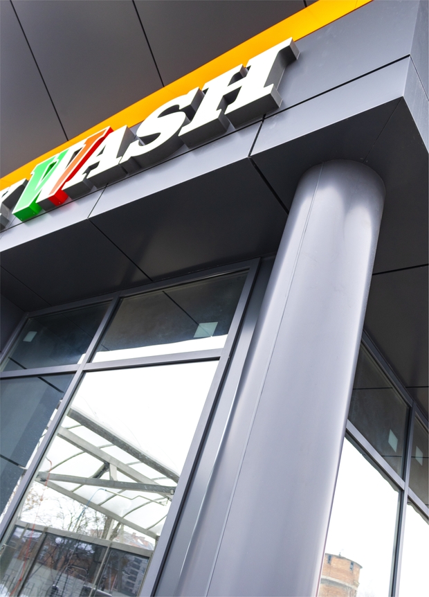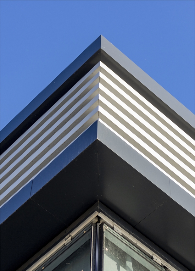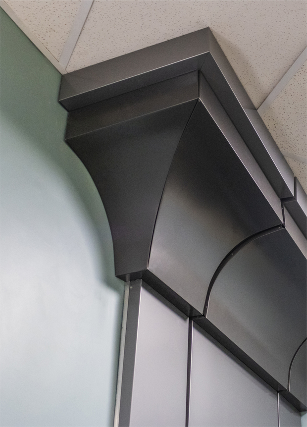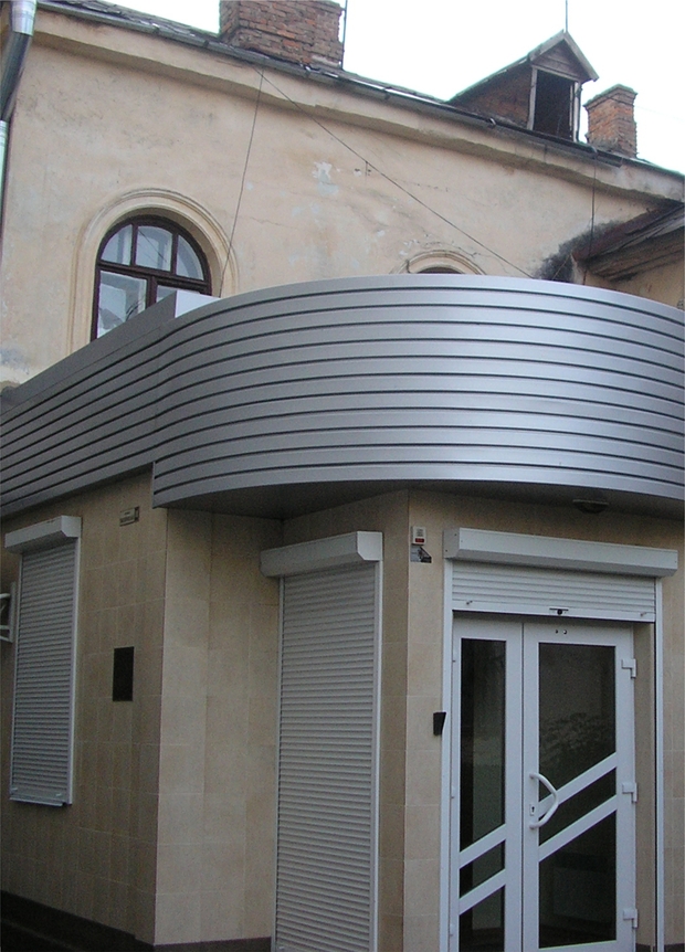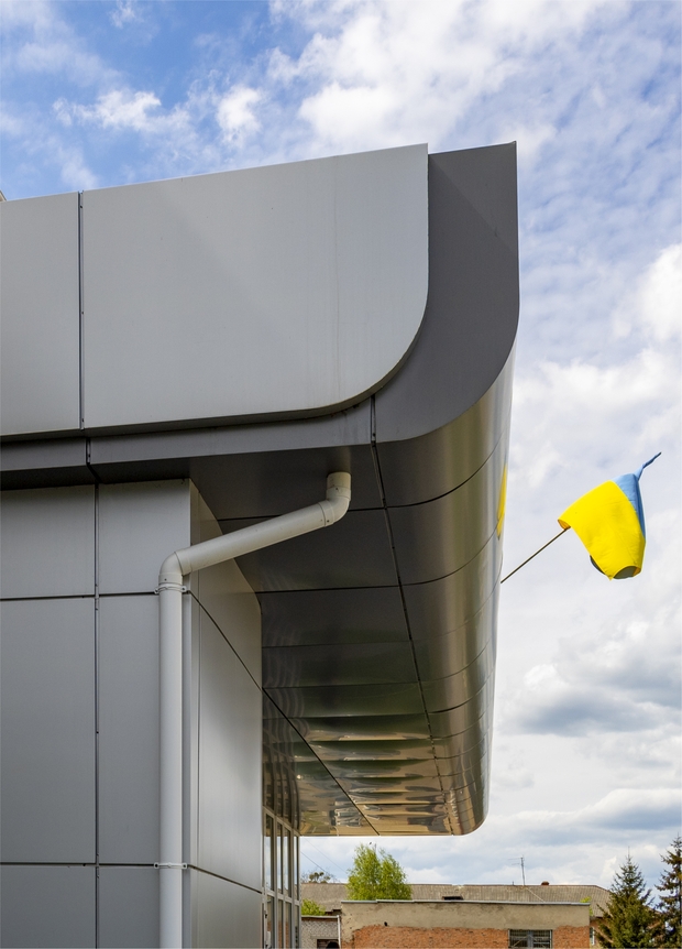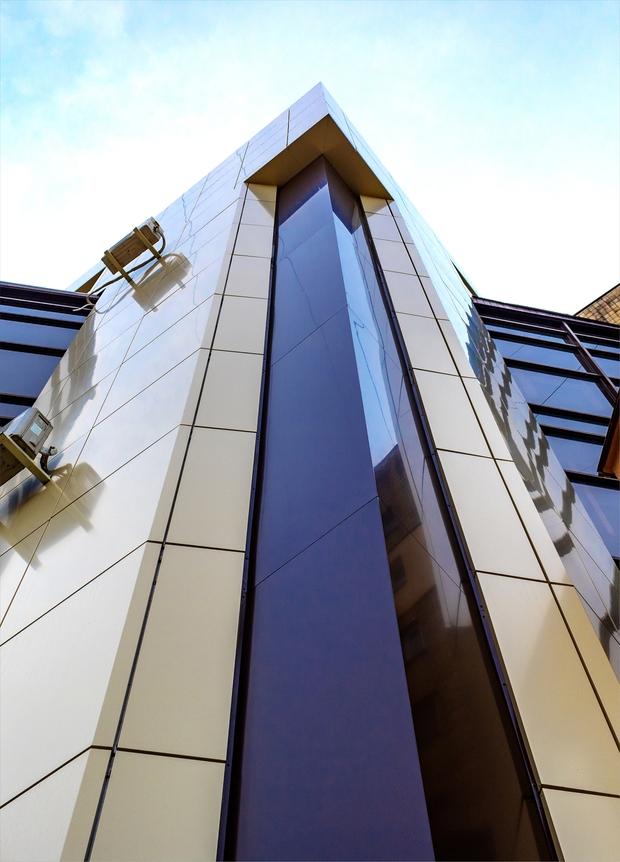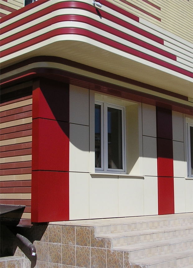 - Вентфасади з профлиста, металосайдингу. На цих фасадах, як правило, архітектурні фасадні елементи облицьовують деталями з гладкого металевого листа. Але, якщо замість металевого листа використовувати АКП, таке облицювання буде більш акуратним. АКП, за рахунок своїх технологічних властивостей, дозволяє досягати значно кращої геометрії поверхні. Таким чином, використання архітектурних елементів з АКП на металевих фасадах робить їх більш благородними та презентабельними.