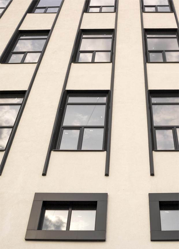 - Вентфасади з керамограніту, Ventarock, емаліту, фіброцементних плит. Використання архітектурних елементів з АКП на таких фасадах створює цікавий контраст фактур. Це дозволяє концентрувати увагу на елементах фасаду і одночасно підкреслювати красу основного облицювального матеріалу. Крім того, іноді елементи з АКП, зроблені в колір фасаду, використовуються, коли робити такі елементи з основного матеріалу неможливо або недоречно.