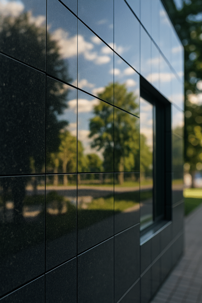 Темний, як нічне скло. Його поверхня створює глибокий дзеркальний ефект і додає фасаду елегантної стриманості. Ідеальний вибір для тих, хто прагне лаконічної, але вишуканої виразності в архітектурі.
