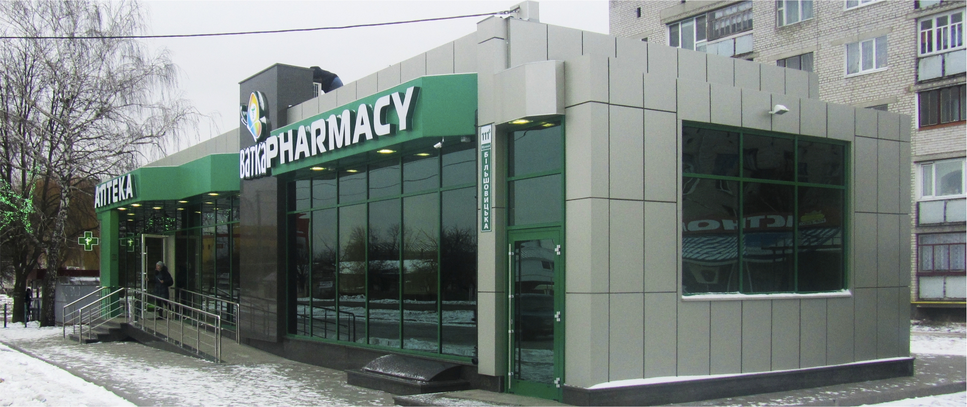 Влаштування вентфасаду з АКП Profibond т.4мм. Алюмінієва підсистема. Тип облицювання – «відкритий руст».