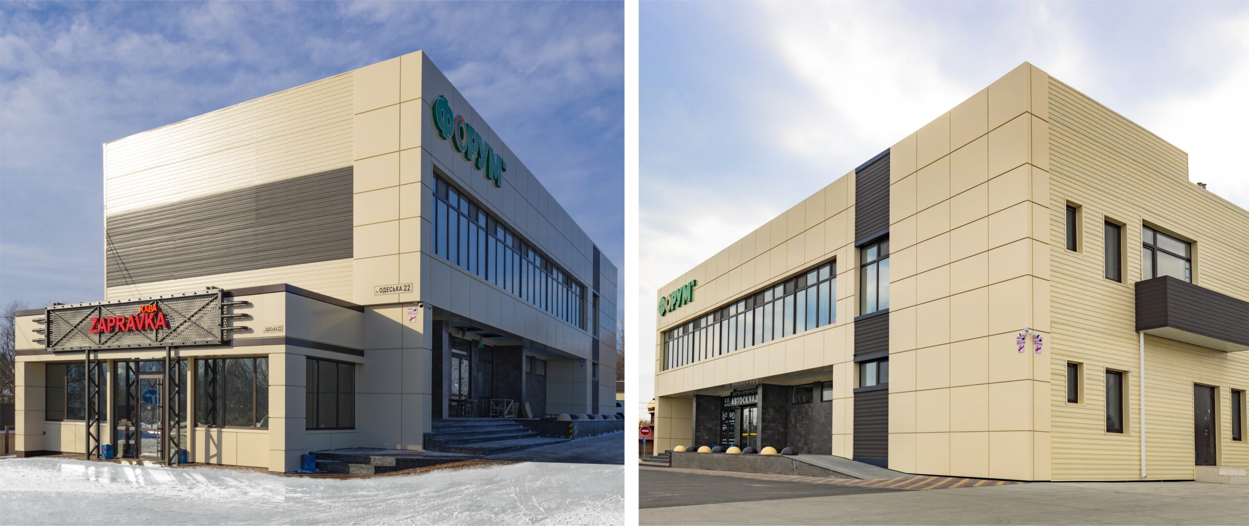 Влаштування вентфасаду з АКП Naturalbond т.4мм. Підсистема з алюмінієвих кутиків. Тип облицювання – «закритий руст». Влаштування вентфасаду з профлиста т.0,5мм. Підсистема з оцинкованих сталевих профілів. Монтаж системи водостоку та софітів.