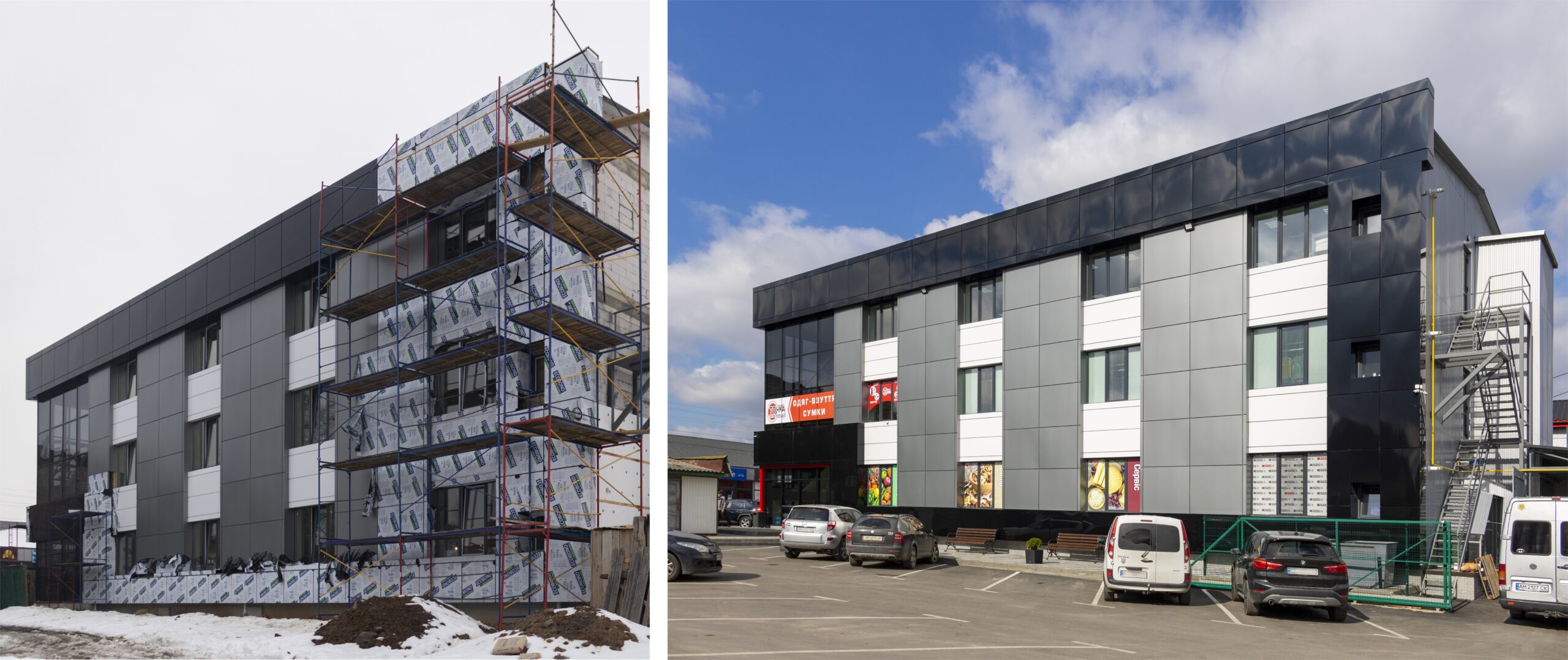 Влаштування вентфасаду з Ecobond т.3мм. Підсистема з оцинкованих сталевих профілів. Тип облицювання – «закритий руст».