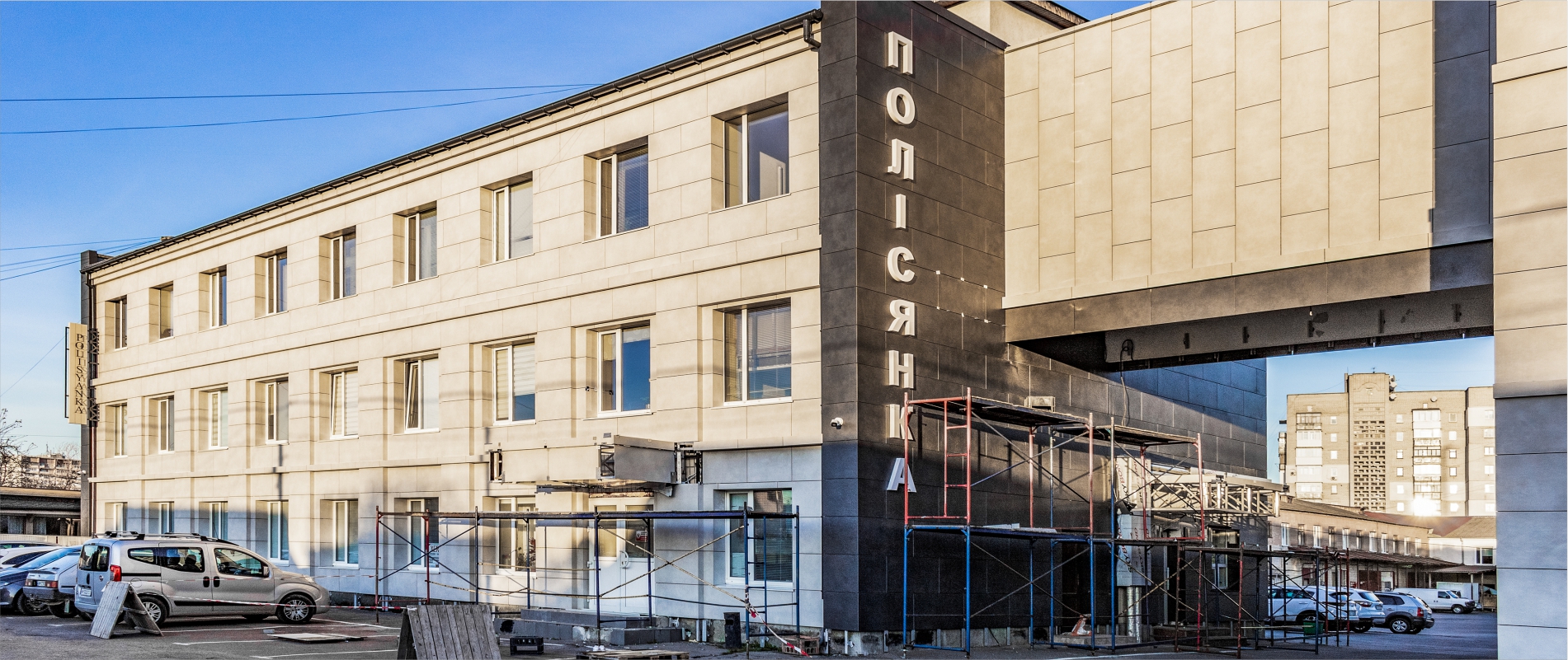 Облицювання стелі проїзду та парапету будівлі алюмінієвими