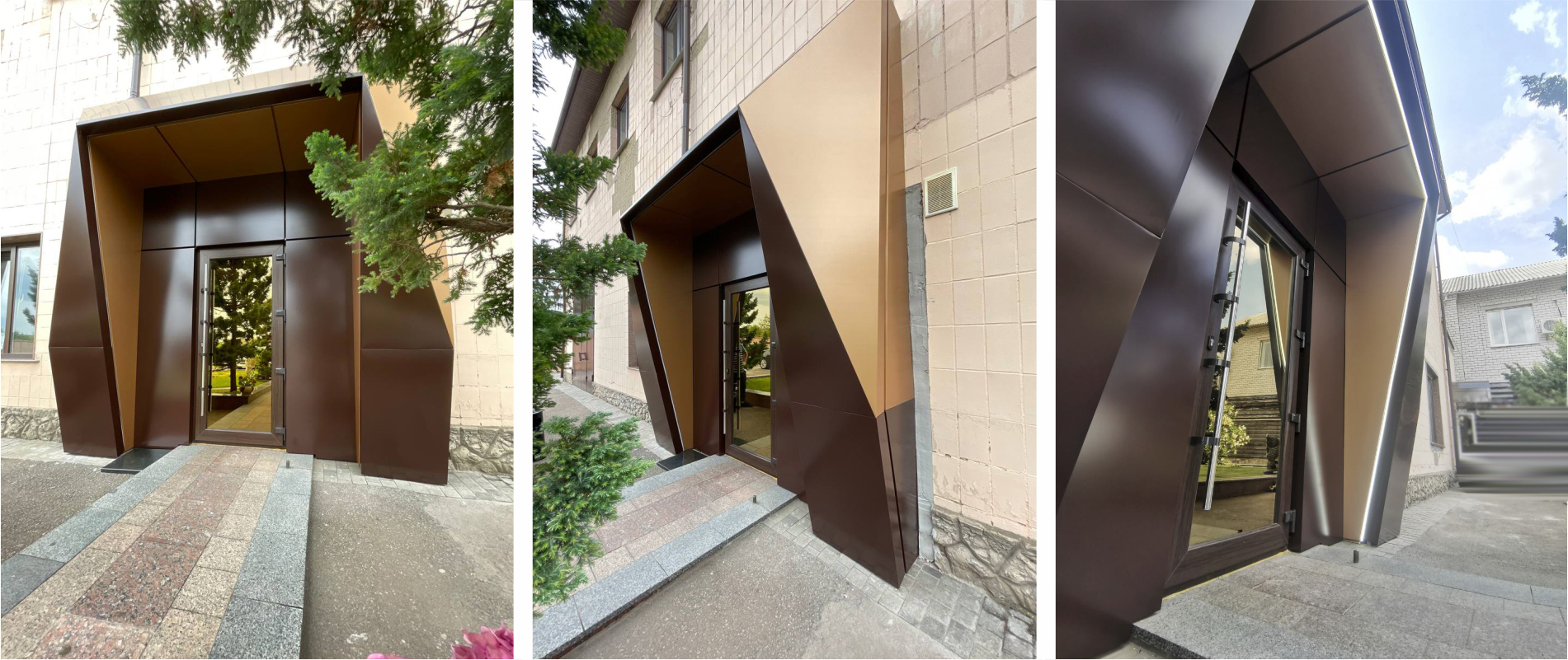 Влаштування вхідної групи з АКП Ecobond т.3мм. Підсистема з оцинкованих сталевих профілів. Тип облицювання – «безшовне з’єднання».