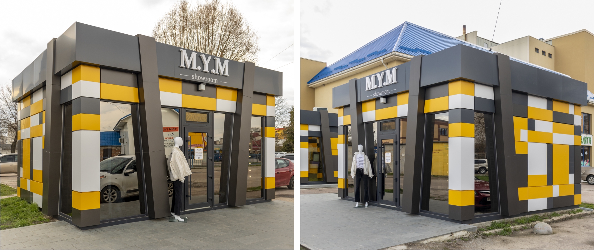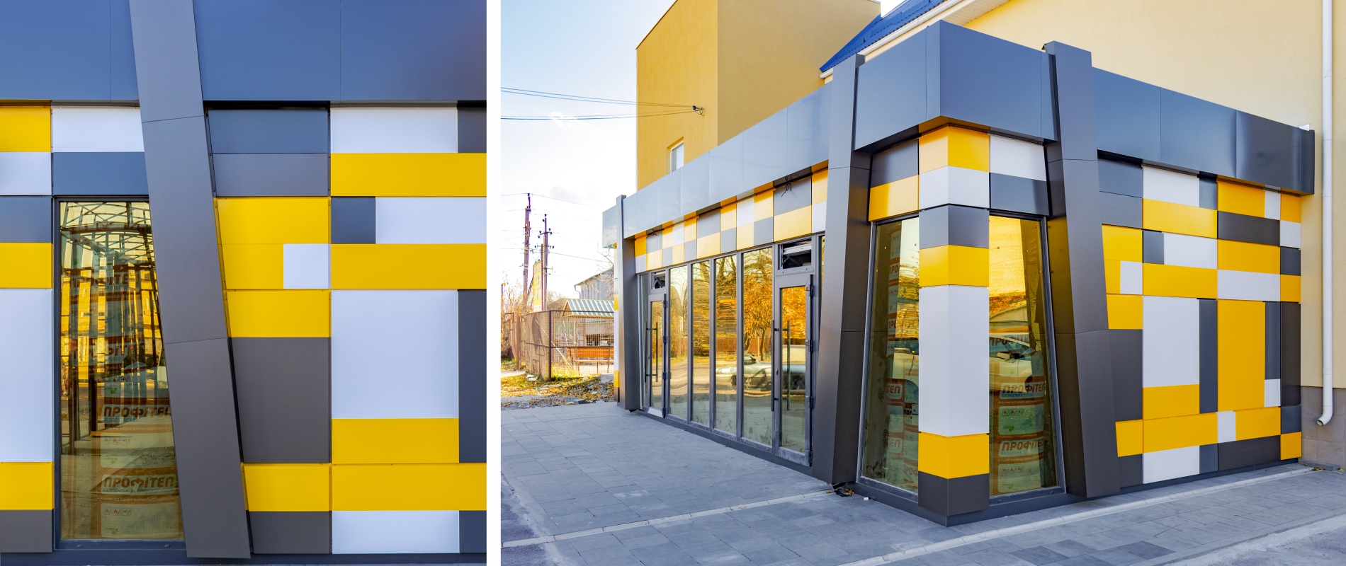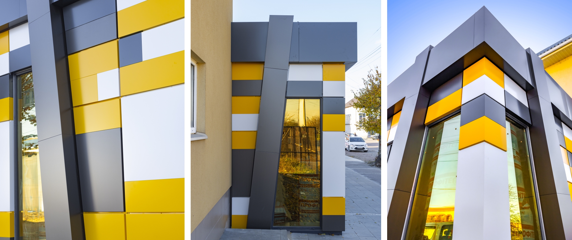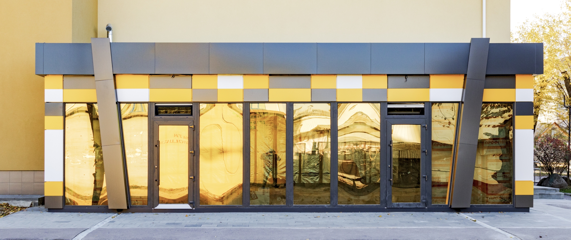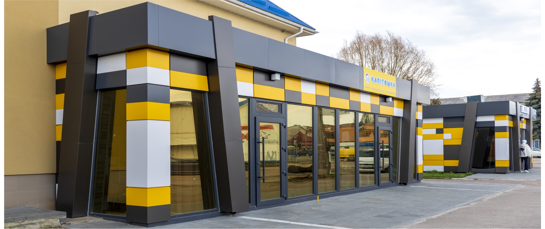 Розробка дизайн-проекту, проектування металоконструкції МАФу. Облицювання МАФу АКП Ecobond т.3мм. Підсистема з оцинкованих профілів економ серії типу СD. Тип облицювання – «закритий руст». Перед монтажем касети об’єднувалися з декількох деталей різного кольору способом «безшовне з’єднання».