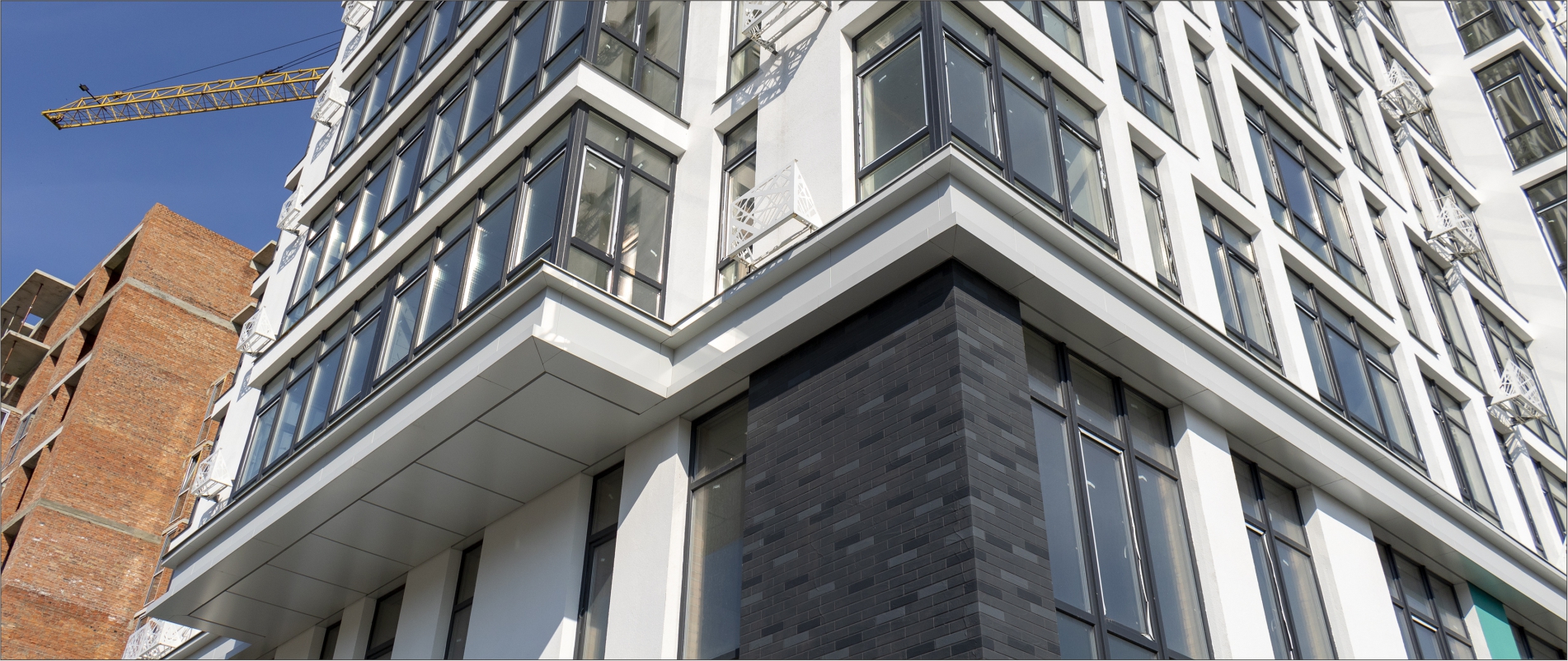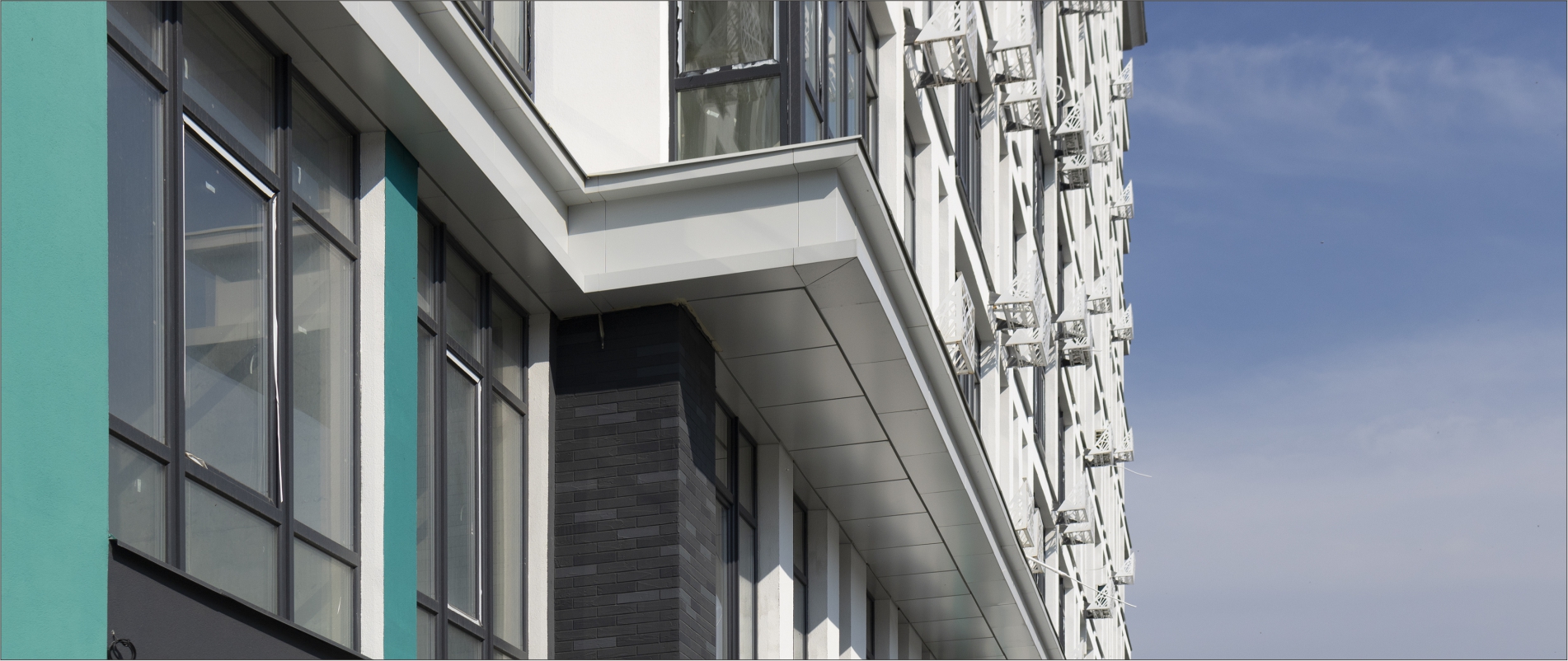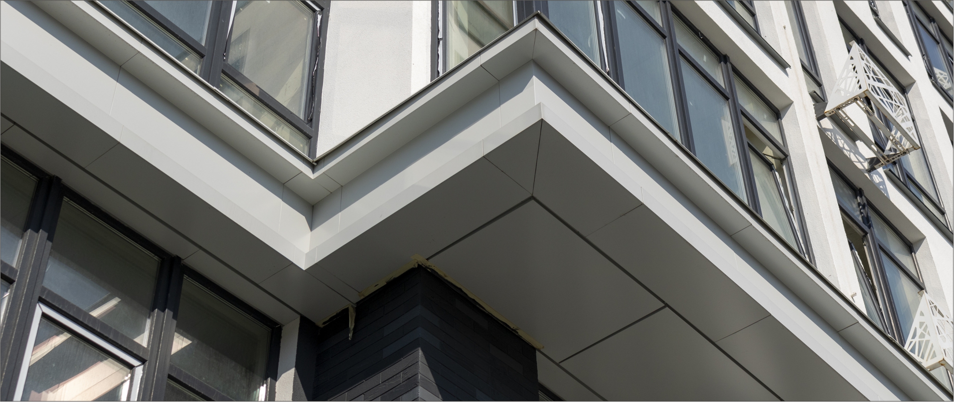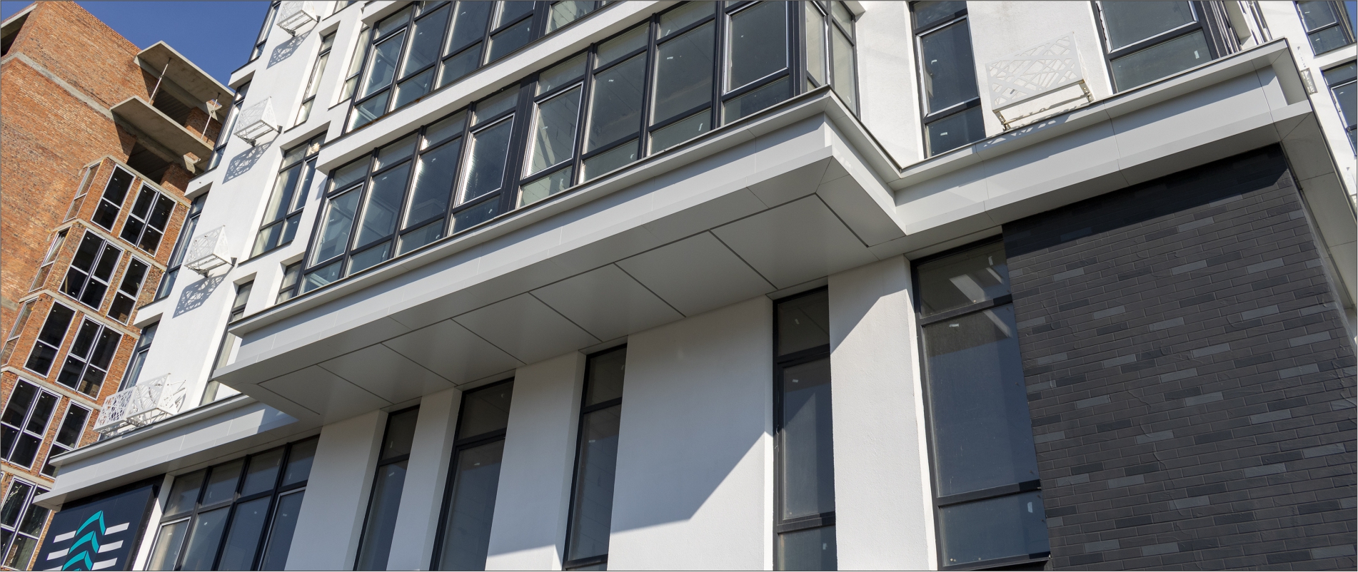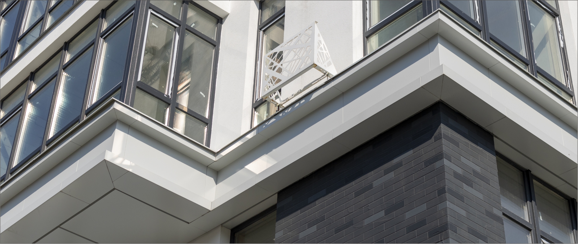 Виготовлення декоративного поясу з АКП Alufas т.4мм. Підсистема з оцинкованих сталевих профілів. Тип облицювання – «закритий руст». Монтаж металоконструкції для утворення форми карнизу.