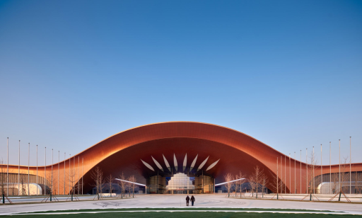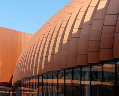 Пекінський виставковий центр (Фото 6,7), відкритий у лютому 2025 року. Яскравий мідний фасад, гнучка модульна система, композитний дах та гібридна вентиляція. Ідеальна демонстрація того, як сучасні вентильовані фасади дозволяють поєднати естетику з енергоефективністю.