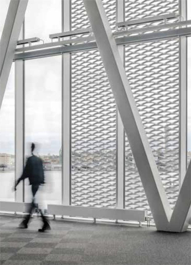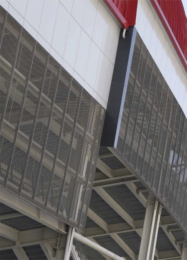 - Завдяки сітчастій структурі фасадні архітектурні сітки, встановлені перед вікнами, пропускають світло всередину приміщень, захищаючи при цьому від зайвого сонячного випромінювання, що дуже важливо для приміщень з великою площею скління – спортивних залів, конференц-залів тощо.